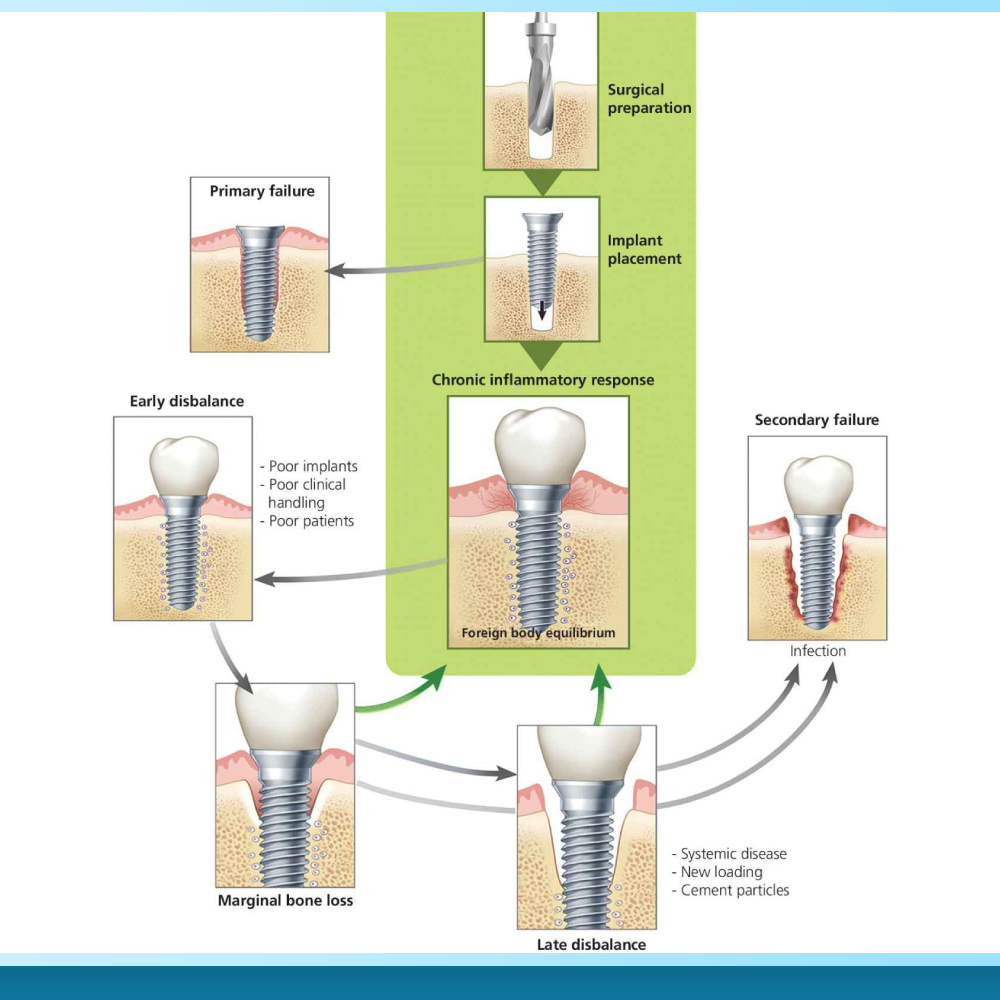 Ở giai đoạn đầu (1-3 tháng sau phẫu thuật), người hút thuốc đối mặt với nguy cơ không tích hợp xương (Failure of Osseointegration). Do thiếu máu nuôi dưỡng, các tế bào xương non không thể mọc len lỏi vào các rãnh ren của trụ Implant. Kết quả là trụ Implant nằm lỏng lẻo trong xương hàm như một chiếc đinh đóng vào tường vôi bở, dẫn đến thất bại ngay lập tức. Thống kê cho thấy tỷ lệ thất bại ở người hút trên 10 điếu/ngày lên tới 15-20%, cao gấp 10 lần so với người không hút thuốc (chỉ khoảng 1-2%).