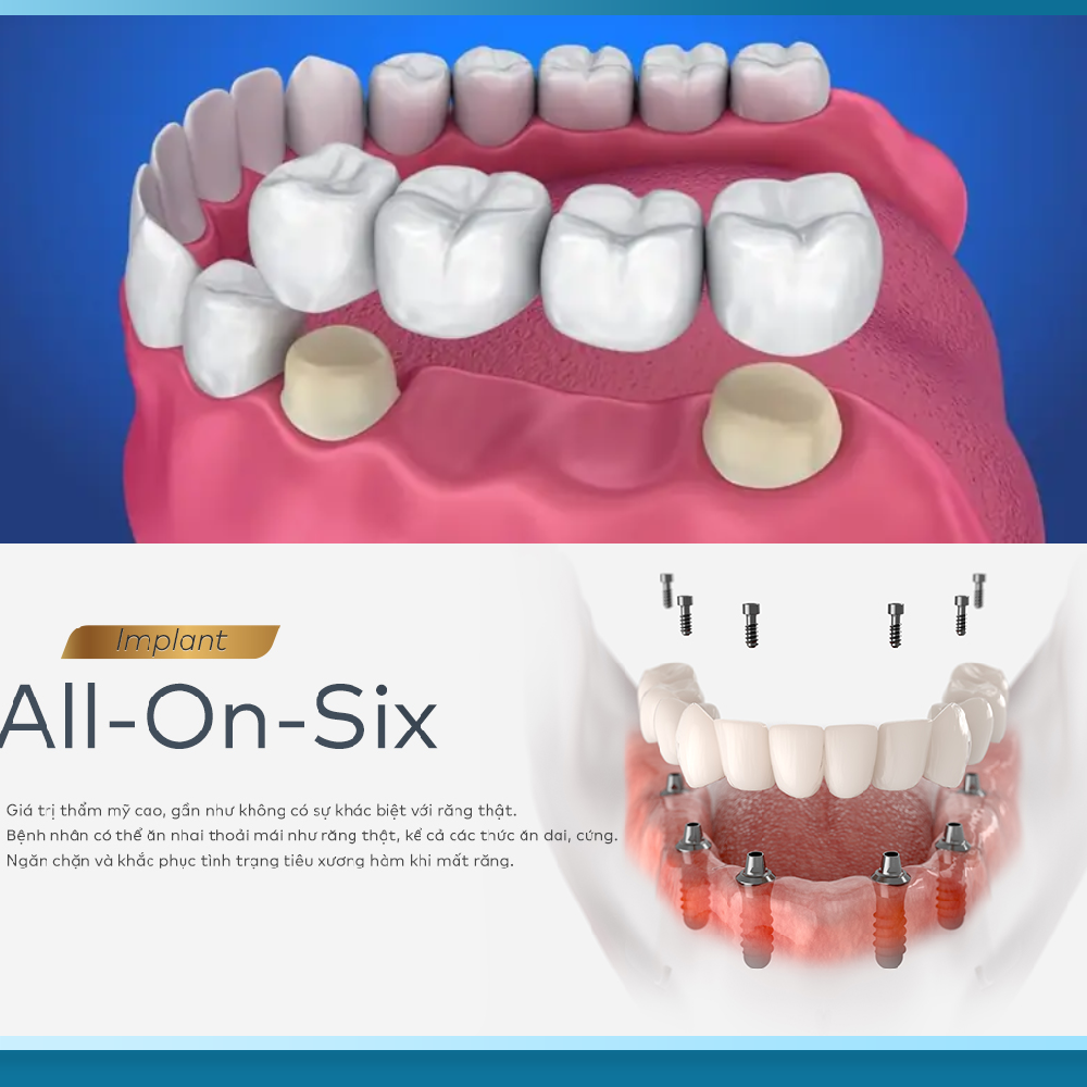 Kỹ thuật phục hình All on 6 và cầu răng sứ dài là hai phương thức phổ biến trong nha khoa phục hồi nhằm giải quyết tình trạng mất nhiều răng hoặc mất răng toàn hàm. All on 6 vận hành dựa trên việc cấy ghép 6 trụ Implant bằng Titanium vào xương hàm để đóng vai trò như những chân răng nhân tạo độc lập.