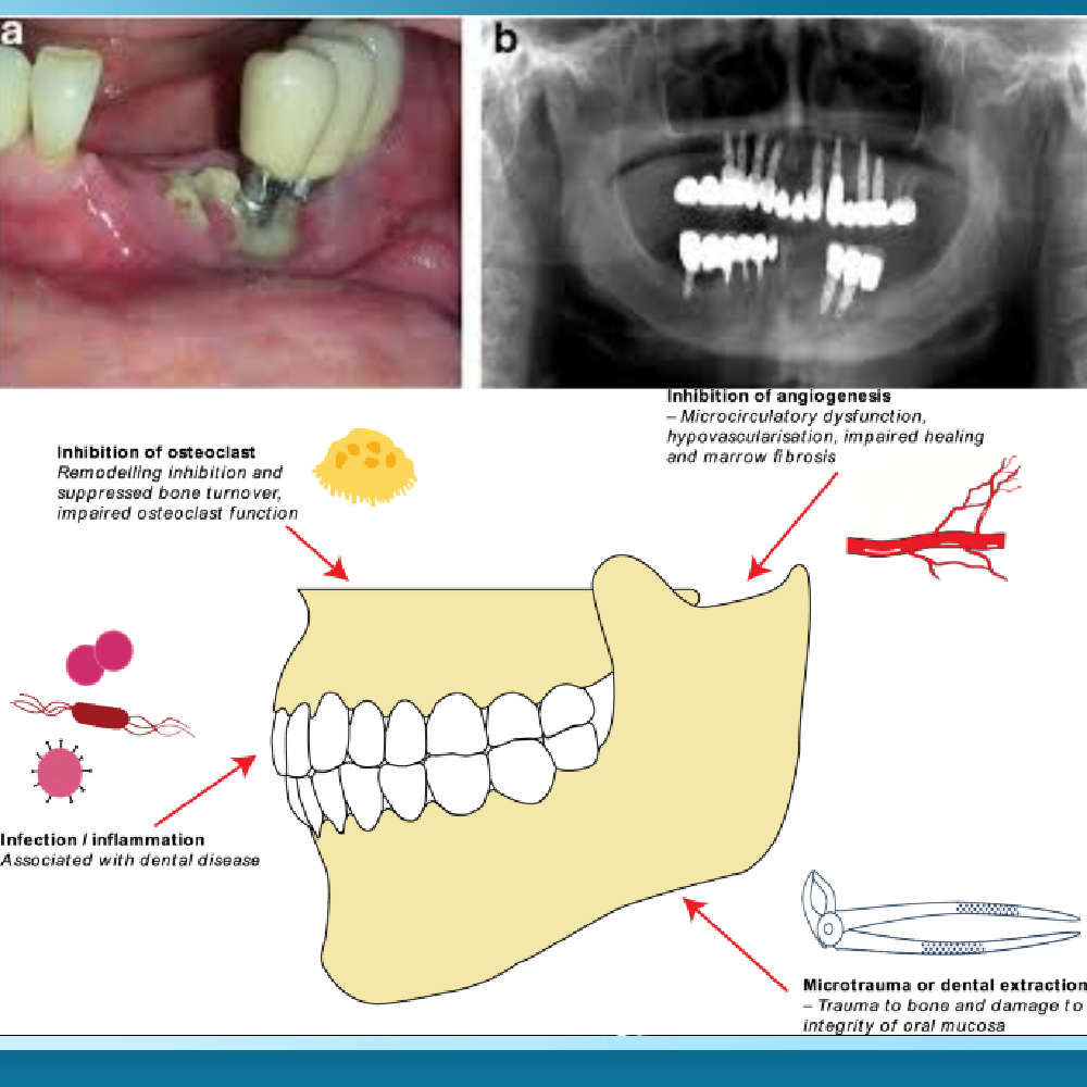 Mặc dù các loại thuốc này mang lại lợi ích to lớn trong việc giảm nguy cơ gãy xương đùi và cột sống, chúng lại tiềm ẩn một biến chứng hiếm gặp nhưng nghiêm trọng trong nha khoa xâm lấn được gọi là hoại tử xương hàm liên quan đến thuốc (Medication-Related Osteonecrosis of the Jaw – MRONJ).