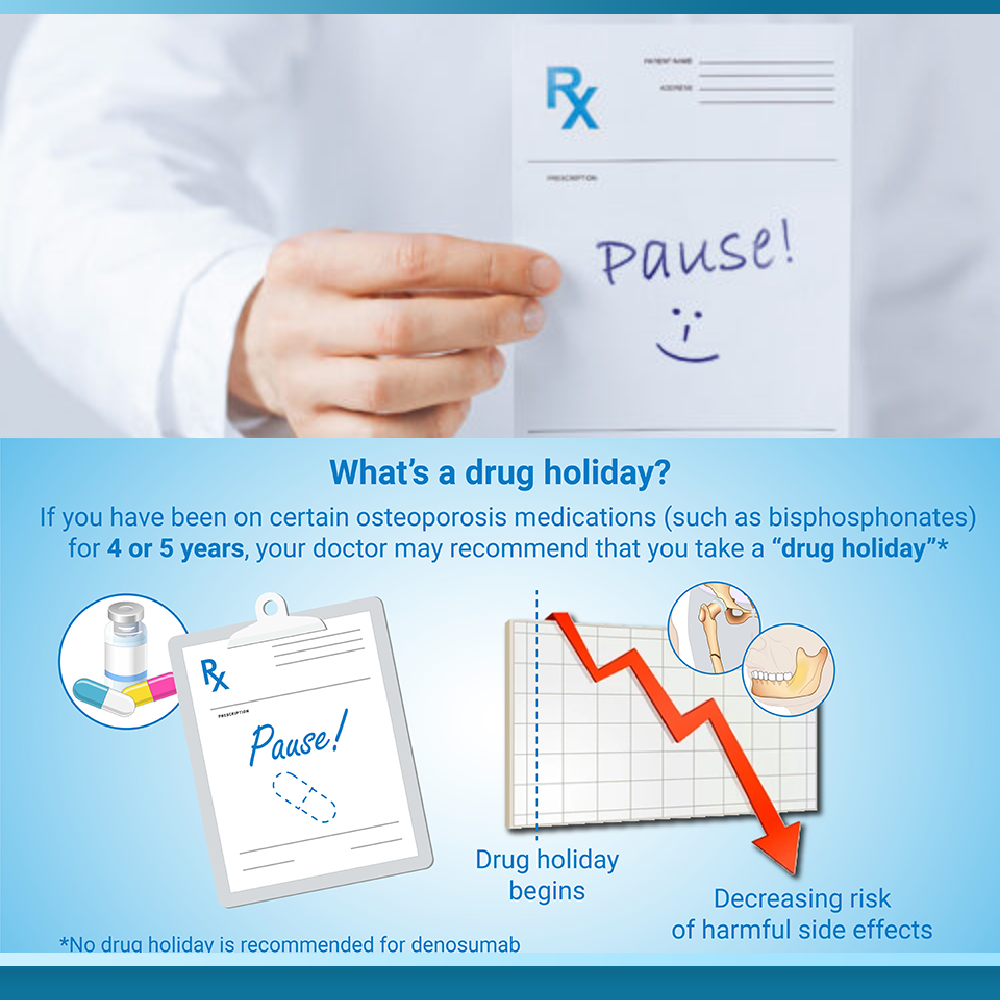 Tuy nhiên, nếu thời gian dùng thuốc đã trên 3 năm, một đợt nghỉ thuốc khoảng 2-3 tháng trước phẫu thuật và chỉ dùng lại sau khi vết thương đã lành hoàn toàn (thường là 3 tháng sau) có thể được cân nhắc để cải thiện tốc độ chuyển hóa xương tại chỗ.