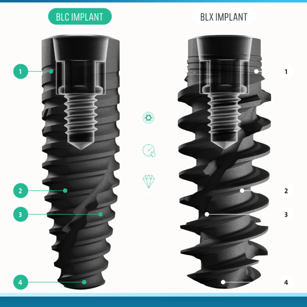 Nobel Biocare là hãng đầu tiên giới thiệu khái niệm All-on-4/All-on-6 trên thế giới, với rất nhiều nghiên cứu lâm sàng dài hạn, cho tỷ lệ thành công cao và ổn định. Straumann nổi tiếng với vật liệu hợp kim Titanium–Zirconium và bề mặt SLActive, được thiết kế để rút ngắn thời gian tích hợp xương và hỗ trợ tải lực sớm ở những case chọn lọc.