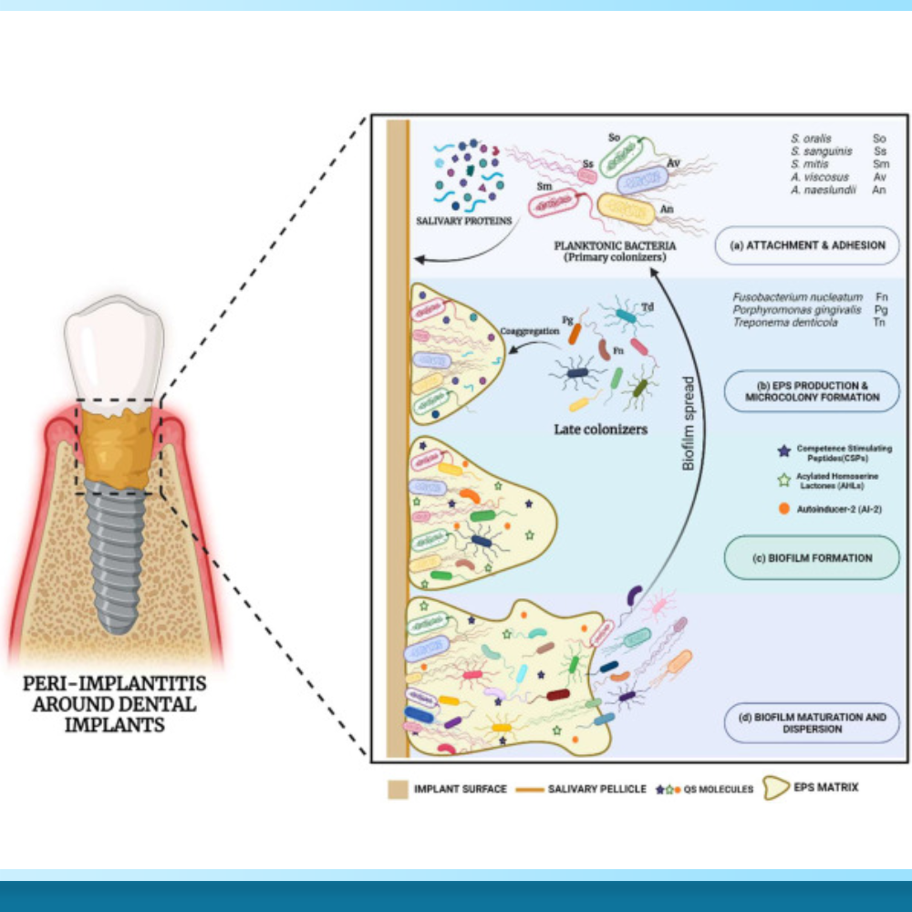 Thủ phạm số 1 chính là vệ sinh răng miệng kém, dẫn đến tích tụ mảng bám vi khuẩn (Biofilm). Đặc biệt với các ca phục hình toàn hàm All on 6, kết cấu thanh bar và cầu răng phức tạp tạo ra nhiều “ngóc ngách” mà bàn chải thường không thể chạm tới. Vi khuẩn tích tụ tại cổ Implant sẽ tiết ra độc tố, kích ứng nướu và khởi phát quá trình viêm nhiễm.